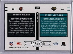 Jersey Carson Palmer, Byron Leftwich 2003 Leaf Rookies & Stars RC Jersey Relic /400