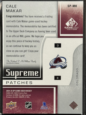 2024-25 UD SP Game Used Supreme Patches Cale Makar #SP-MK 09/15