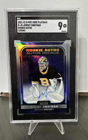21-22 O-Pee-Chee Platinum Jeremy Swayman Cosmic Rookie Auto SGC 9