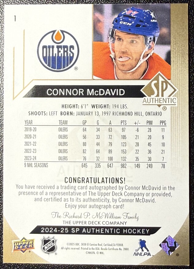 2024-25 SP Authentic Connor McDavid Limited Black Gold Ink Auto SSP