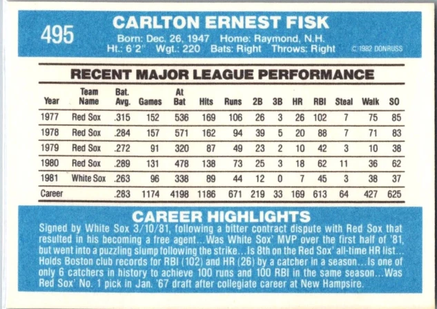 This is a nice example of a 1982 Donruss #495 Carlton Fisk