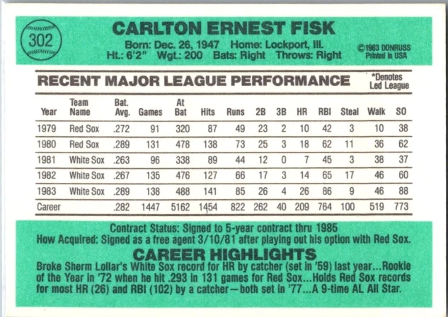 This is a nice example of a 1984 Donruss #302 Carlton Fisk