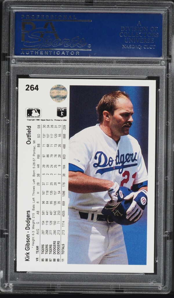 The product is a 1990 Upper Deck trading card featuring Kirk Gibson from the Los Angeles Dodgers in Major League Baseball. This card is part of the base set for that season and has been professionally graded for authenticity and condition. The card number is 264 and it is a valuable collectible for fans of baseball and sports trading cards. Kirk Gibson is a significant player in baseball history, making this card a desirable piece for collectors.