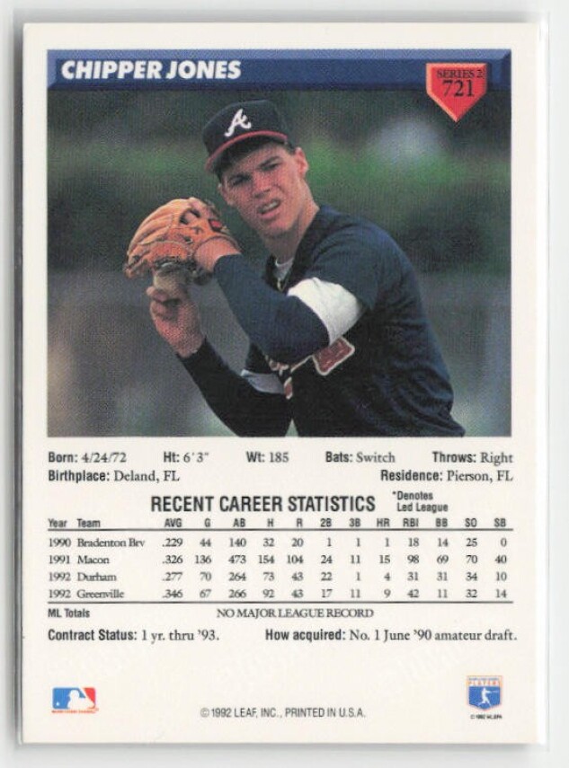 You are purchasing a 1993 Donruss Chipper Jones #721. You will receive the exact item in the photographs. Thank you for looking.