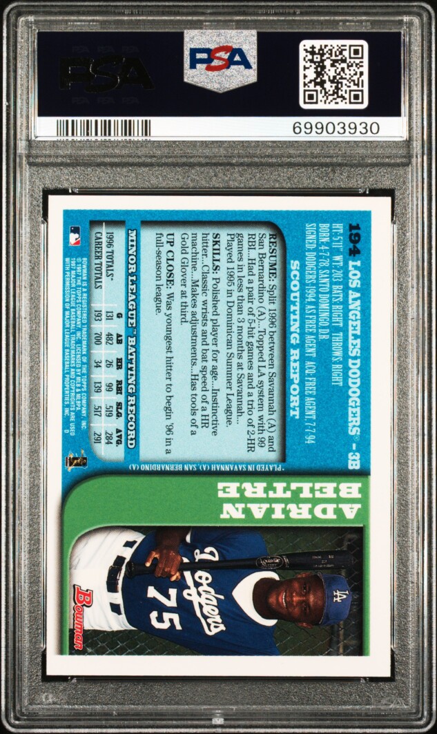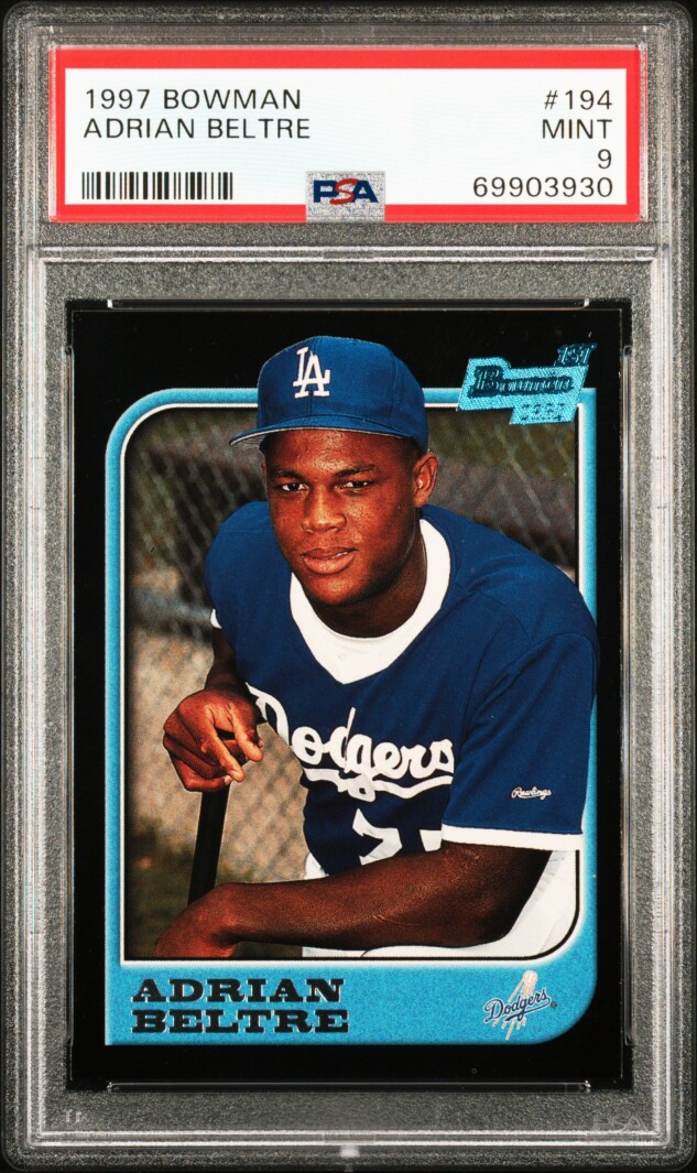 The product is a 1997 Bowman Chrome Adrian Beltre #194 PSA 9 Mint Rookie Card (RC) featuring the Hall of Famer who has played for teams like the Los Angeles Dodgers, Texas Rangers, and Boston Red Sox. This baseball trading card is part of the Bowman series by Topps, showcasing Beltre in his early years in Major League Baseball (MLB). A valuable collector's item for fans of the sport and collectors of vintage baseball cards.