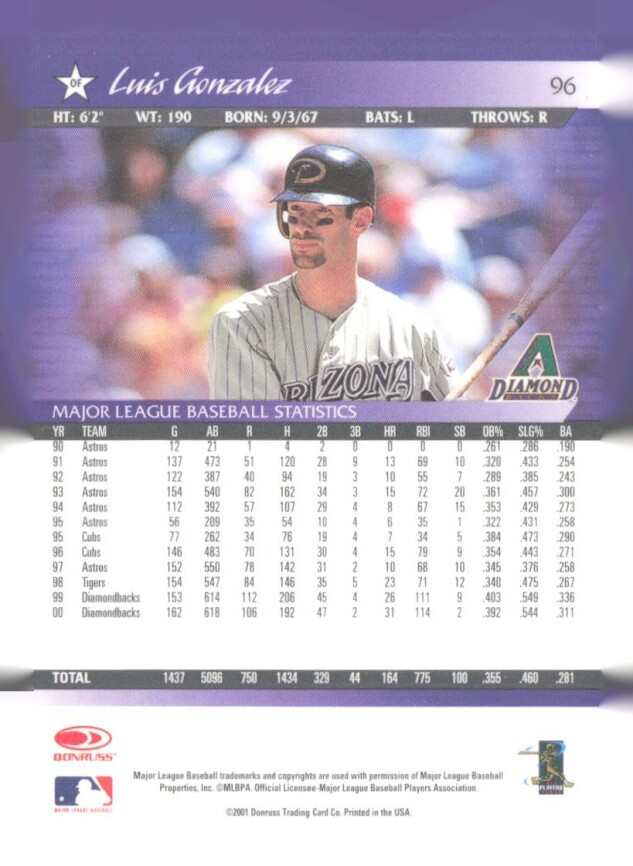 You are purchasing a 2001 Donruss Luis Gonzalez #96. You will receive the exact item in the photographs. Thank you for looking.