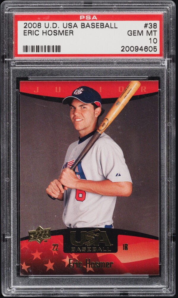 The product is a 2008 Upper Deck USA Baseball Eric Hosmer Rookie #38 sports trading card graded as a PSA 10 GEM MINT. This card features Eric Hosmer as a rookie player from the 2008 season and is certified by Upper Deck with the certification number 20094605. As a highly graded card, it holds value for collectors and fans of the sport looking to add a rare and pristine piece to their collection.