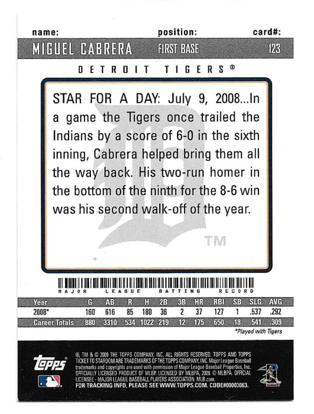 2009 TOPPS TICKET TO STARDOM #123 MIGUEL CABRERA
