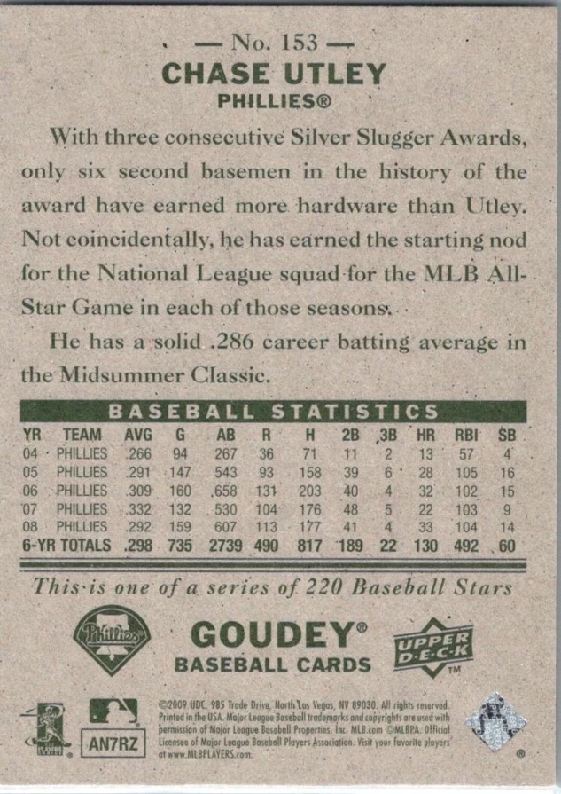 This is a nice example of a 2009 Upper Deck Goudey #153 Chase Utley