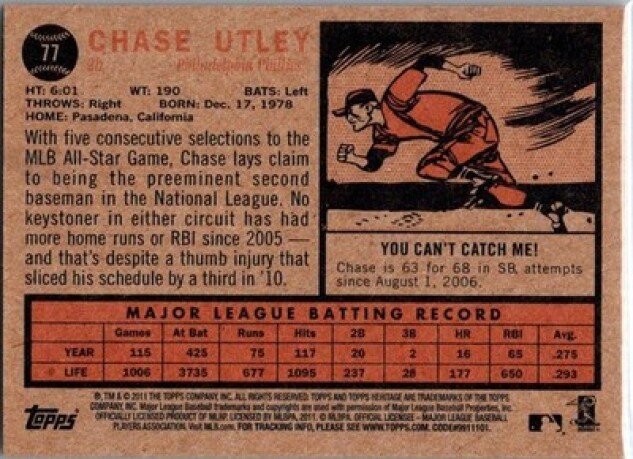 This is a nice example of a 2011 Topps Heritage #77 Chase Utley