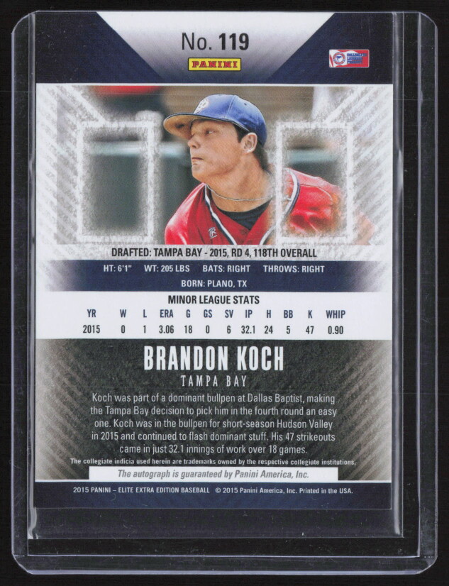 You are purchasing a 2015 Panini Elite Extra Edition Brandon Koch #119. You will receive the exact item in the photographs. Thank you for looking.