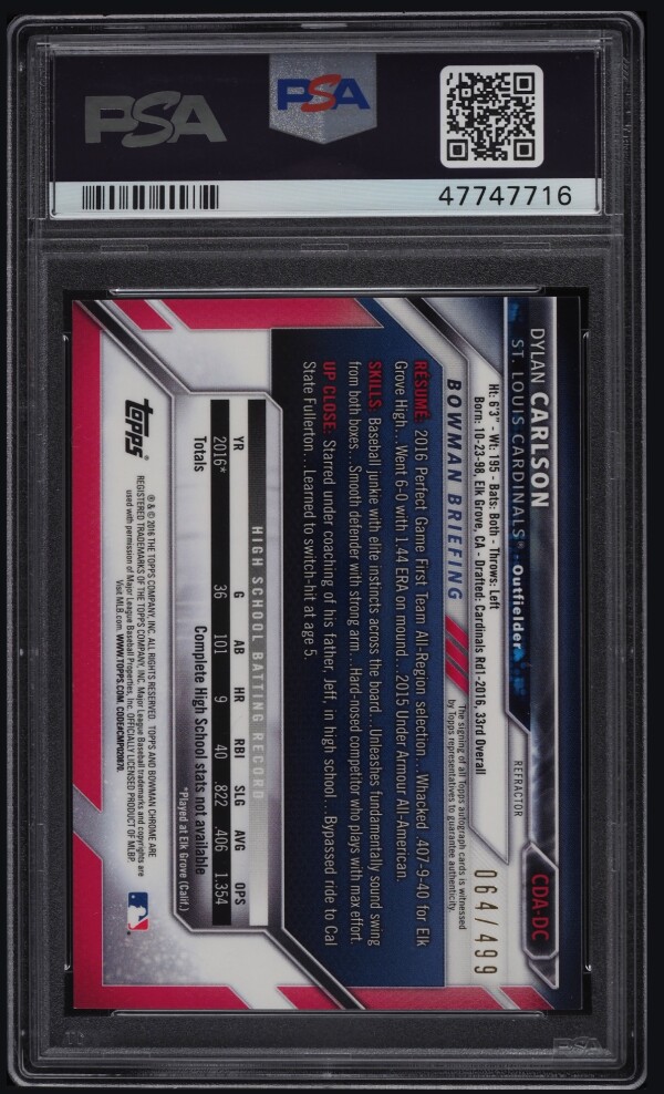 The 2016 Bowman Chrome Refractor Dylan Carlson PROSPECT AUTO /499 PSA 10 GEM MINT trading card is a highly sought-after collectible in the sports trading card market. This autographed card features a hard-signed signature from Dylan Carlson, a promising player in Major League Baseball. Authenticated by Professional Sports Authenticator (PSA), this limited edition card is serial numbered and graded as a PSA 10 GEM MINT, making it a valuable addition to any baseball card collection. With only 499 copies produced, this card is a rare and valuable find for fans and collectors alike.