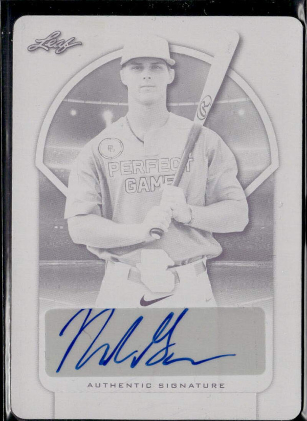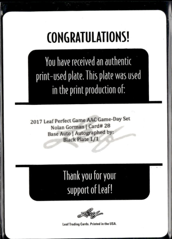 2017 LEAF PERFECT GAME-DAY SET BLACK PRINTING PLATE AUTOGRAPH #28 NOLAN GORMAN