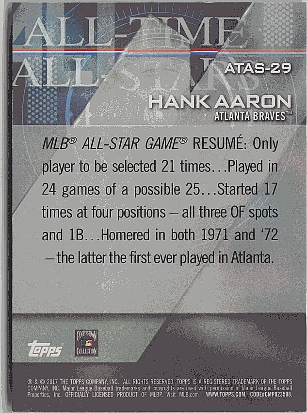 You are purchasing a 2017 Topps Hank Aaron #ATAS-29 All-Time All-Stars. You will receive the exact item in the photographs. Thank you for looking.