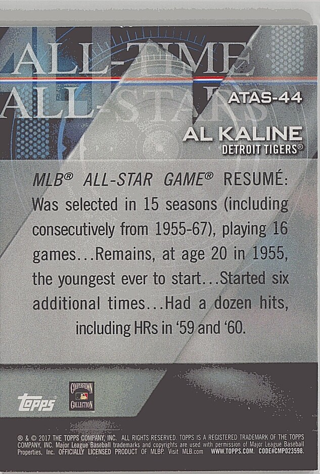 You are purchasing a 2017 Topps Al Kaline #ATAS-44 All-Time All-Stars. You will receive the exact item in the photographs. Thank you for looking.