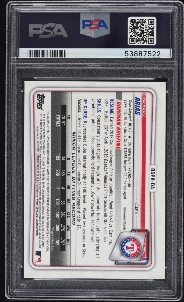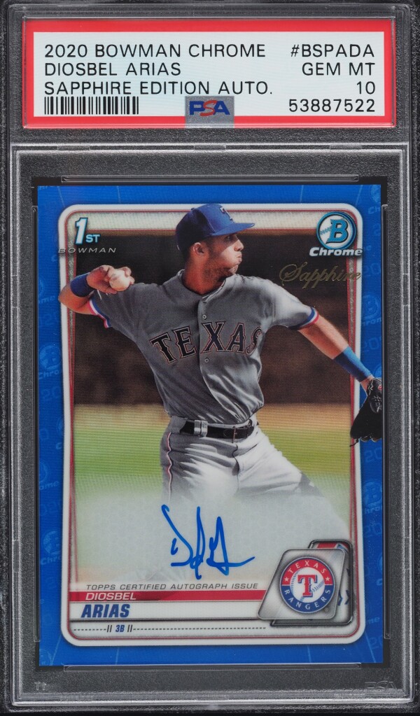 The 2020 Bowman Chrome Sapphire Edition Prospect Autographs Diosbel Arias #BSPA-DA trading card is a highly sought-after collectible for baseball fans and card collectors alike. Featuring the rookie signature of Diosbel Arias from the Texas Rangers, this card is part of the Prospect Autographs insert set by Topps. With a sleek design and limited certification number, this sports trading card is a valuable addition to any baseball card collection for the 2020 season.