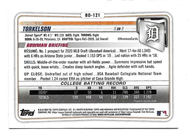 2020 BOWMAN DRAFT 1ST EDITION #BD-121 SPENCER TORKELSON (RC) (1ST BOWMAN)