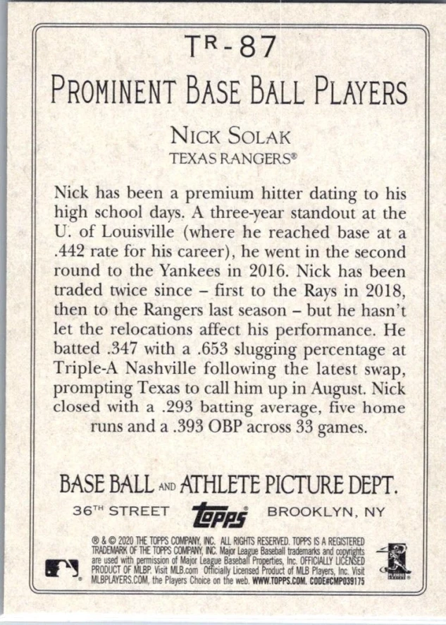 This is a nice example of a 2020 Topps #TR-87 Nick Solak Turkey Red 2020 (Series 2)