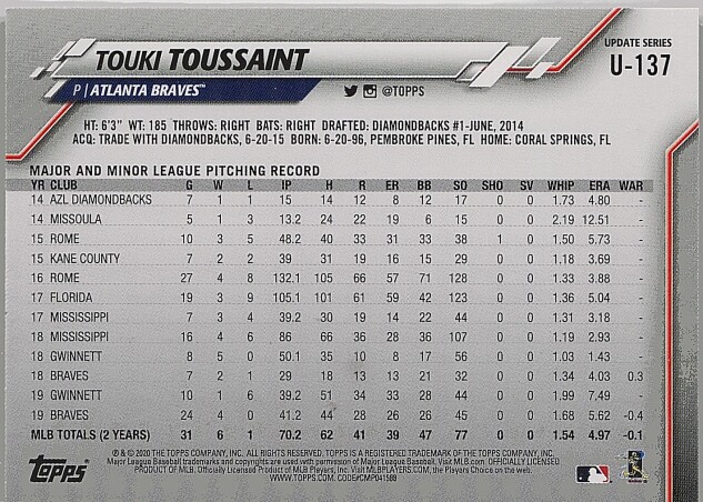 You are purchasing a 2020 Topps Update Touki Toussaint #U-137. You will receive the exact item in the photographs. Thank you for looking.