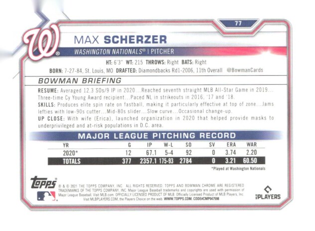 You are purchasing a 2021 Bowman Chrome Max Scherzer #77. You will receive the exact item in the photographs. Thank you for looking.