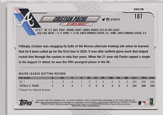 You are purchasing a 2021 Topps Cristian Pache #187 RC. You will receive the exact item in the photographs. Thank you for looking.