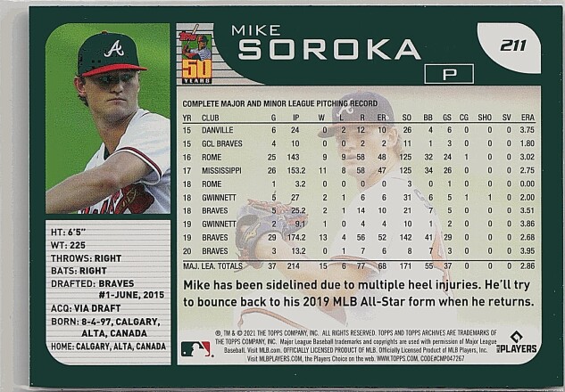 You are purchasing a 2021 Topps Archives Mike Soroka #211. You will receive the exact item in the photographs. Thank you for looking.