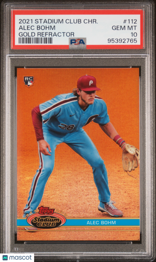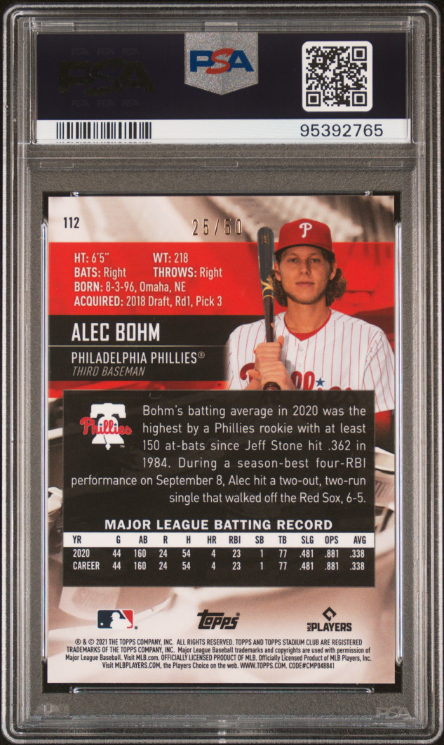 You are purchasing a 2021 Topps Stadium Club Chrome Alec Bohm #112 PSA 10. You will receive the exact item in the photographs. Thank you for looking.