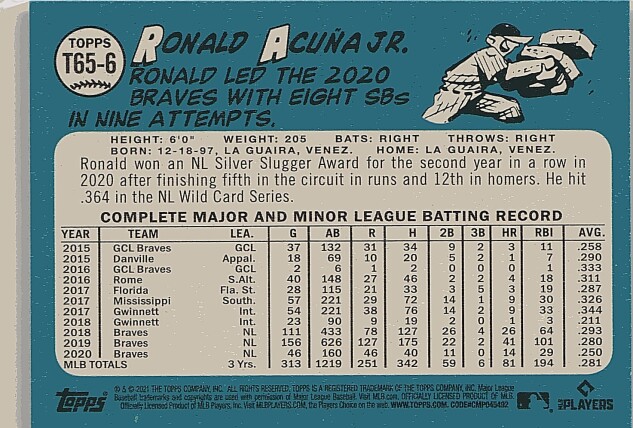 You are purchasing a 2021 Topps Ronald Acuña Jr. #T65-6 1965 Topps Redux. You will receive the exact item in the photographs. Thank you for looking.