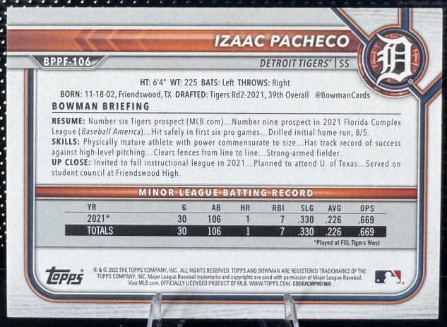 2022 Bowman 1st Edition Izaac Pacheco Blue Foil /150 #BPPF-106