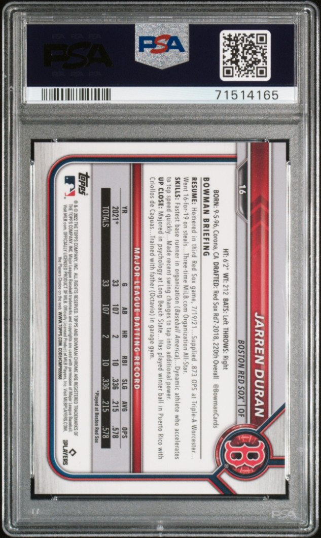Thanks for your looking at my listing 2022 Bowman Chrome X Jarren Duran Gold X-fractor 1/1 PSA 10. Let me know if you have any questions!
