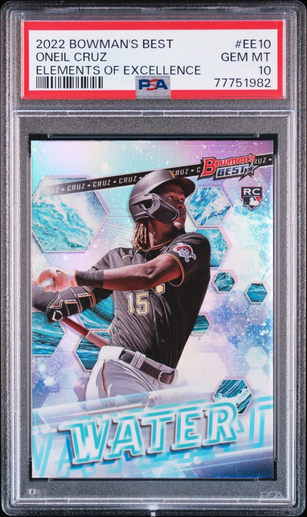 The product is a 2022 Bowman's Best Elements of Excellence Oneil Cruz PSA 10 RC Pirates trading card. Manufactured by Topps, the card features a standard size and is made of card stock. This rookie insert is part of the Elements of Excellence set and is graded as a perfect 10 by Professional Sports Authenticator (PSA). The card showcases the player Oneil Cruz from the Pittsburgh Pirates in Major League Baseball for the 2022 season. It is a highly sought-after collectible for baseball fans and card enthusiasts.