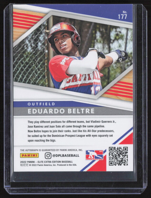 You are purchasing a 2022 Panini Elite Extra Edition Eduardo Beltre #177. You will receive the exact item in the photographs. Thank you for looking.