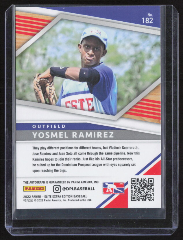 You are purchasing a 2022 Panini Elite Extra Edition Yosmel Ramirez #182. You will receive the exact item in the photographs. Thank you for looking.