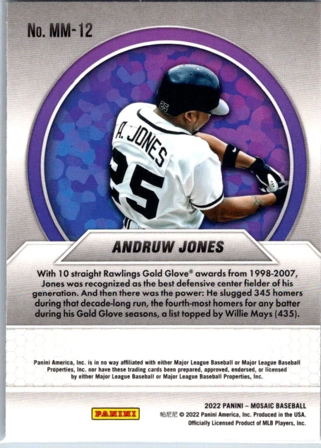 This is a nice example of a 2022 Panini Mosaic #MM-12 Andruw Jones Men of Mastery