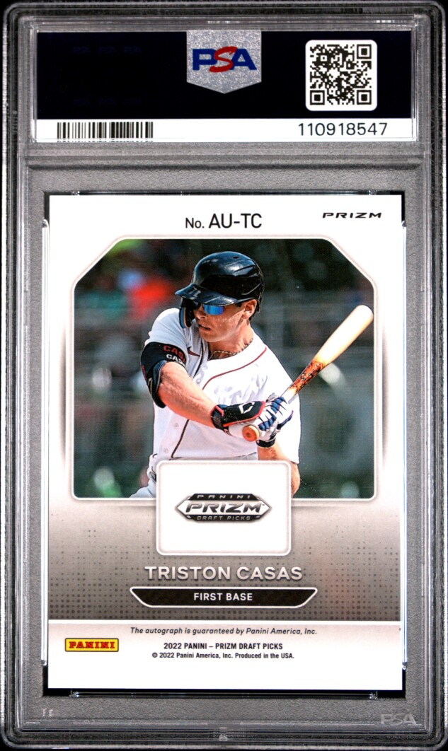 The 2022 Panini Prizm Draft Picks Triston Casas Rookie Auto trading card is a highly sought-after collectible for baseball fans and card collectors. This autographed card featuring the promising player from the Boston Red Sox is a valuable addition to any collection. With a PSA 9 Mint grade, this card is of top quality and condition, making it a prized item for fans of Major League Baseball and sports trading cards in general.