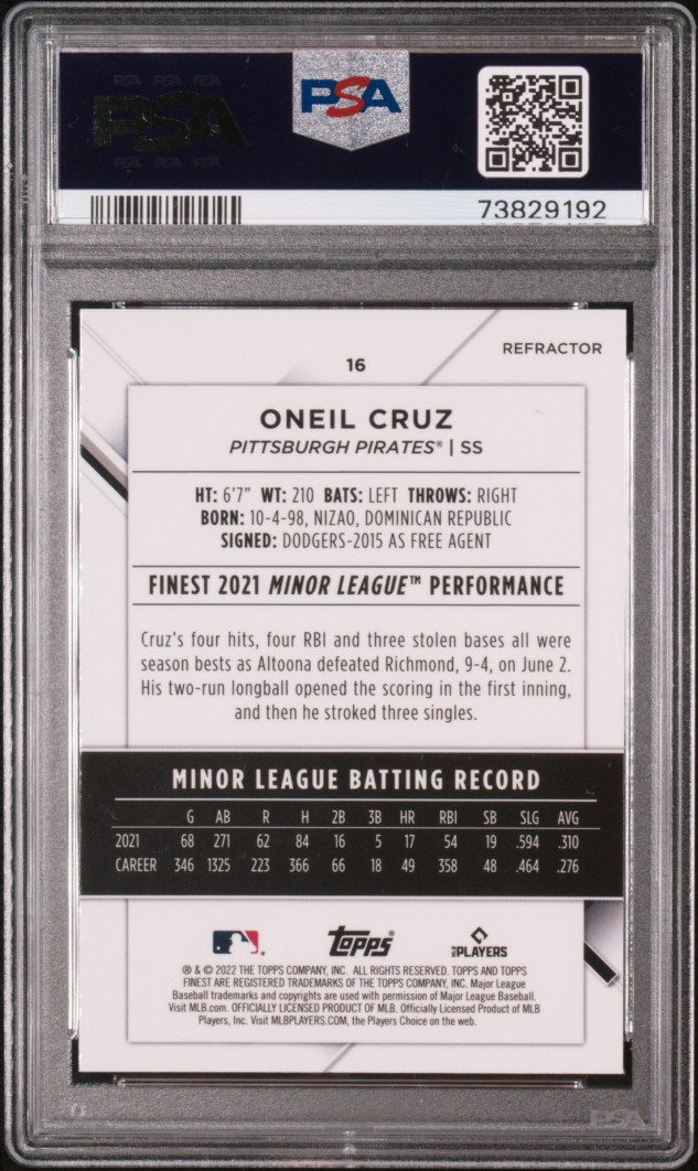 O'Neil Cruz 2022 Finest Refractor Rookie. Graded PSA 10.