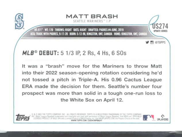 You are purchasing a 2022 Topps Update Matt Brash #US274 Rainbow Foil. You will receive the exact item in the photographs. Thank you for looking.