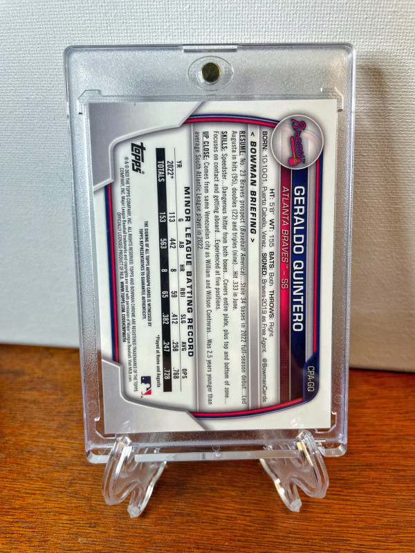 This is (1) 2023 Bowman Chrome 1st GERALDO QUINTERO Auto Purple Refractor #/250 #CPA-GQ. Thank you for checking out my listing!