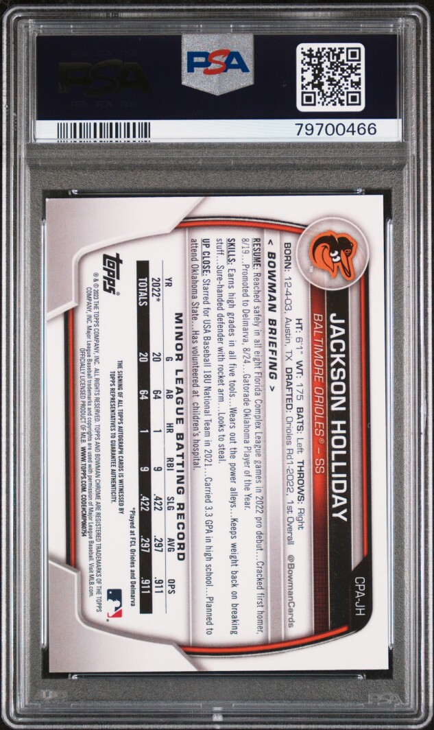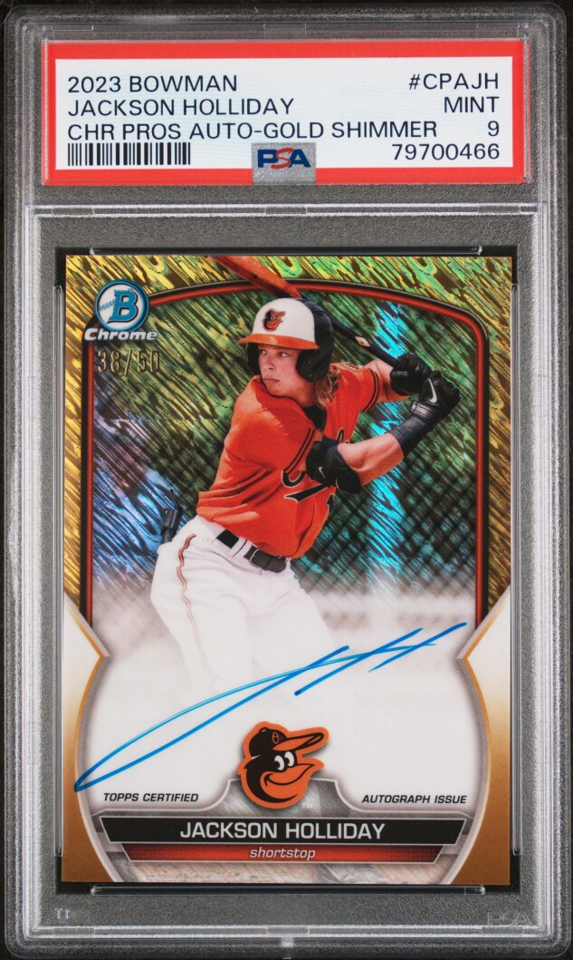 The product is a rare and highly sought-after 2023 Bowman Chrome Jackson Holliday Gold Shimmer Auto trading card, featuring an autograph from the promising young baseball player of the Baltimore Orioles. With a limited print run of only 50, this PSA 9 graded card is a valuable addition to any sports card collection. This special edition card is part of the Chrome Prospect Autographs insert set, making it a sought-after item for Major League Baseball fans and collectors alike.