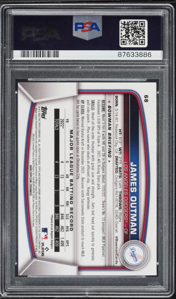 The product is a 2023 Bowman Chrome Sapphire James Outman rookie trading card graded as a PSA 10 Gem Mint. This card features a sleek Sapphire parallel design and is part of the Bowman Chrome set. As a rookie card, it holds special significance for collectors and fans of James Outman, a promising player in the baseball world. With the assurance of a PSA 10 grading, this card is sure to be a prized possession for any trading card enthusiast.