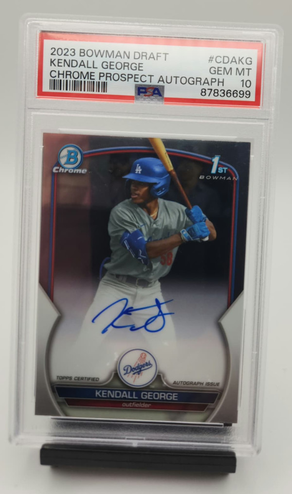 This is an absolute must-have rookie autograph for any serious Dodgers collector or prospect investor. Kendall George was the Dodgers' 1st Round Pick (36th Overall) in the 2023 MLB Draft, and this is his coveted 1st Bowman Chrome Autograph — graded a perfect PSA 10 GEM MINT.
