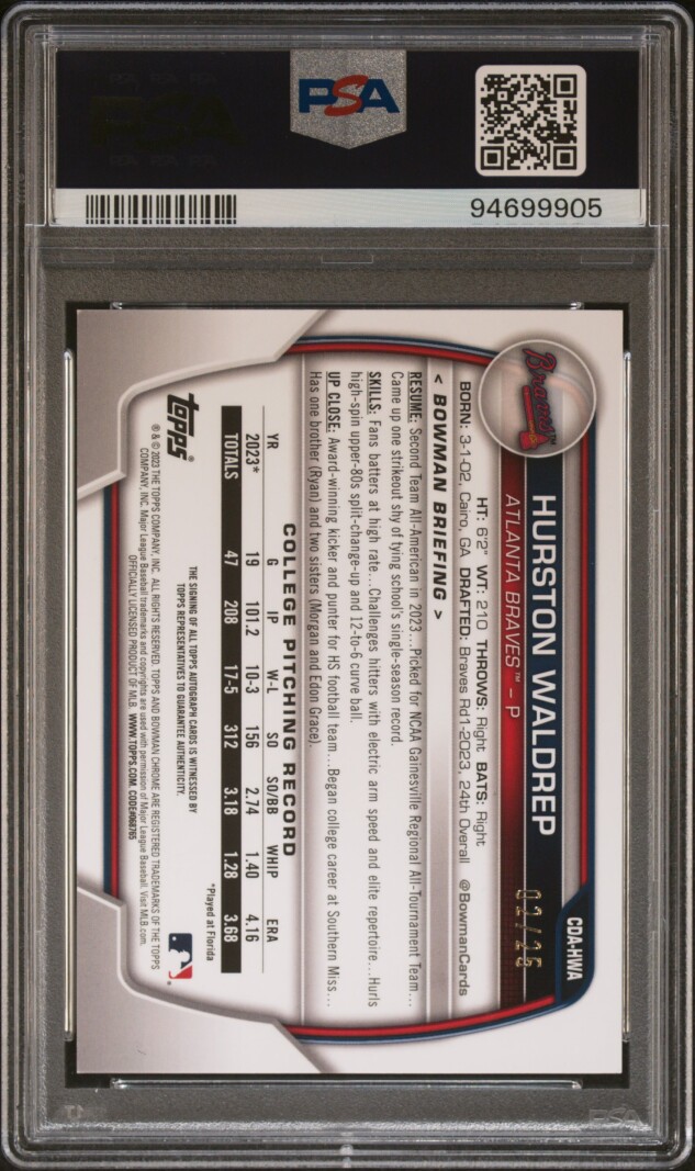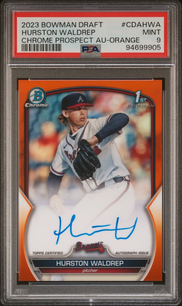 The 2023 Bowman Draft Hurston Waldrep Chrome Prospect Orange Ref Auto /25 PSA 9 is a highly sought-after sports trading card featuring baseball player Hurston Waldrep from the Atlanta Braves. This limited edition card is autographed by the player himself and graded as a PSA 9 by Professional Sports Authenticator. It is a parallel variety card with an orange refractor finish, part of the Chrome Prospect Autographs insert set. This rare card is a valuable addition to any sports trading card collection, especially for fans of the MLB World Series and Major League Baseball.