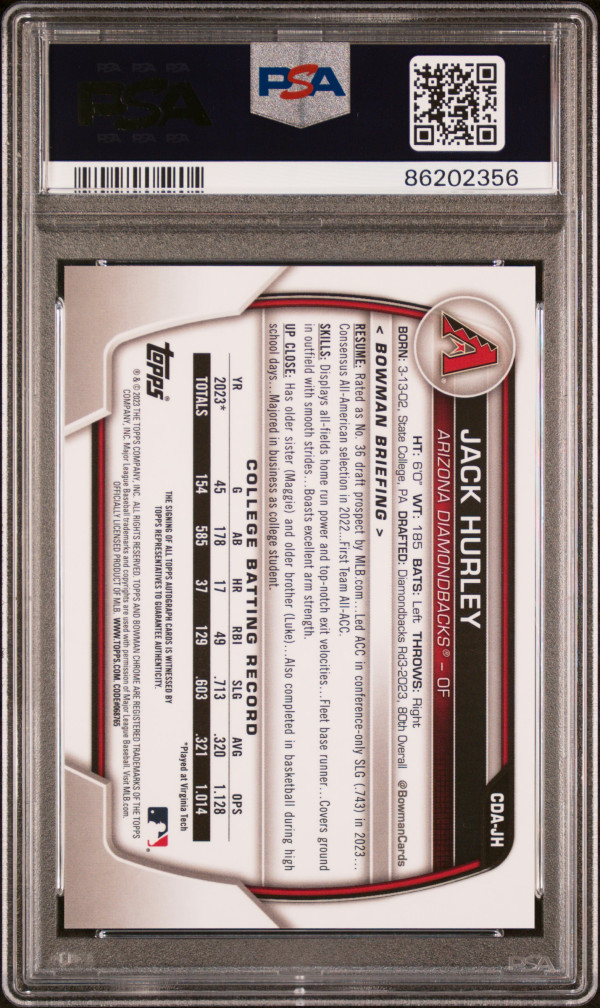 You are purchasing a 2023 Bowman Draft Chrome Prospect Autograph Jack Hurley #CDAJH PSA 10. You will receive the exact item in the photographs. Thank you for looking.