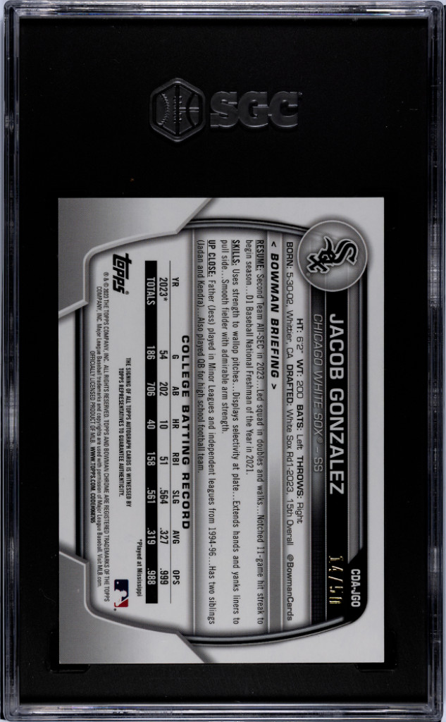 You are purchasing a 2023 Bowman Draft Jacob Gonzalez #CDA-JGO SGC 9.5. You will receive the exact item in the photographs. Thank you for looking.