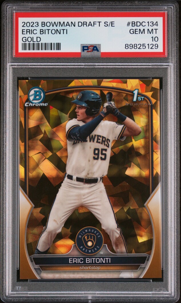 The 2023 Bowman Chrome Draft Sapphire Eric Bitonti 1st Gold Refractor /50 PSA 10 trading card is a highly sought-after collectible item for baseball fans and card collectors. This limited edition card features a rare gold parallel variety with a limited print run of only 50, making it a valuable addition to any sports memorabilia collection. Graded as a PSA 10 by Professional Sports Authenticators, this card is in pristine condition and showcases the rookie player Eric Bitonti from the Milwaukee Brewers. A must-have for fans of Major League Baseball and collectors of sports trading cards.