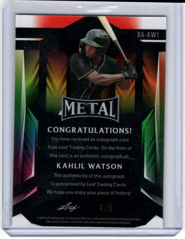 You are purchasing a 2023 Leaf Metal Kahlil Watson #BA-KW1 /6. You will receive the exact item in the photographs. Thank you for looking.