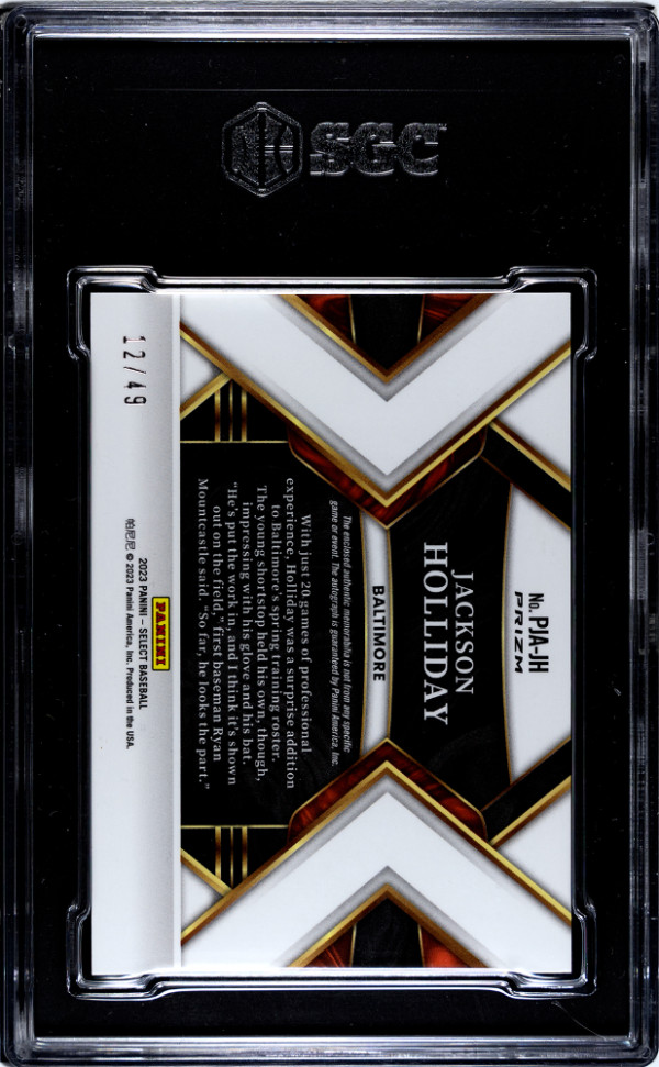 You are purchasing a 2023 Panini Select Jackson Holliday #PJA-JH Rookie Jersey Autograph Tri Color Prizm SGC 8 Auto 10. You will receive the exact item in the photographs. Thank you for looking.