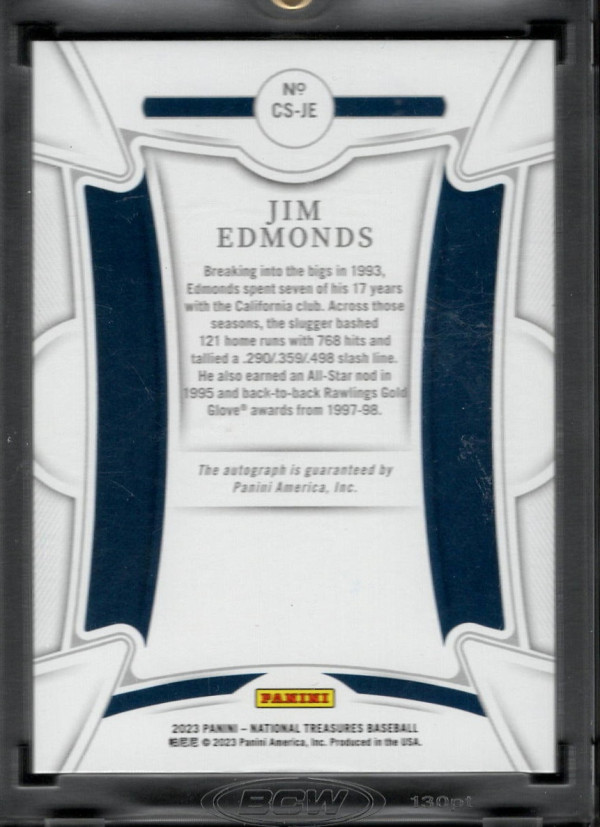 You are purchasing a 2023 Panini National Treasures Century Signatures Jim Edmonds #CS-JE /25. You will receive the exact item in the photographs. Thank you for looking.