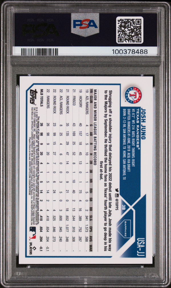 You are purchasing a 2023 Topps Chrome Update Sapphire Edition Autograph Josh Jung #JJ Green 90/99 PSA 10. You will receive the exact item in the photographs. Thank you for looking.