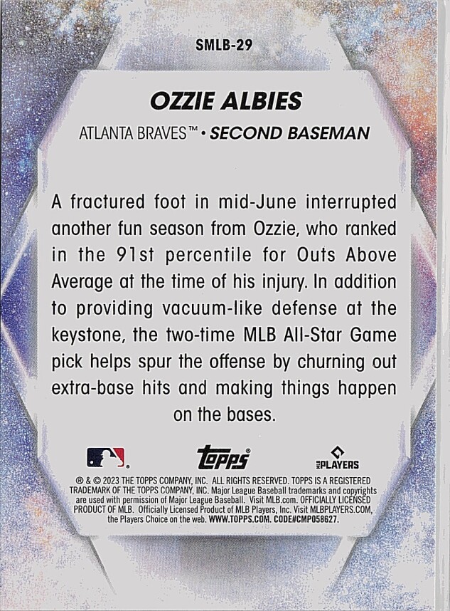 You are purchasing a 2023 Topps Ozzie Albies #SMLB-29 Stars of MLB. You will receive the exact item in the photographs. Thank you for looking.